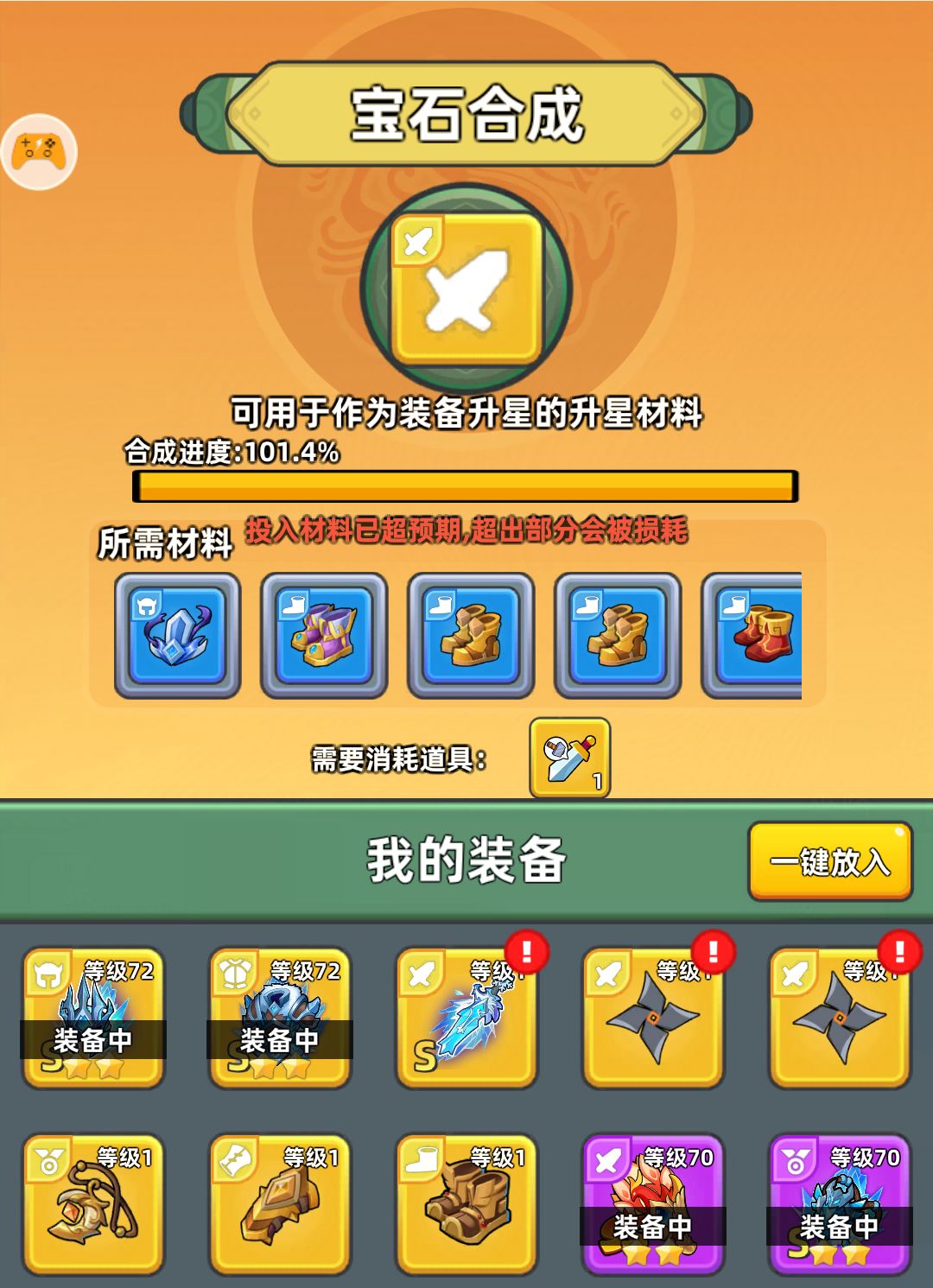 这周的奖励是碎片自选箱和锻造锤。这里介绍一下锻造锤,这个不是直接当垫子用的,而是可以把任意装备的低阶融合成一个对应颜色的垫子,后面你某个部位的垫子溢出的时候可以给缺的部位补垫子。后面开双武器,我们要养2-3个武器的时候武器垫子就会很缺,这时候武器锻造锤就很重要了。