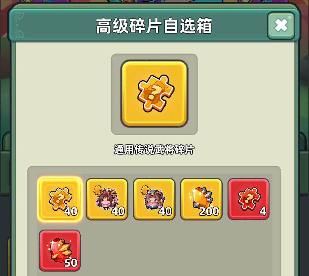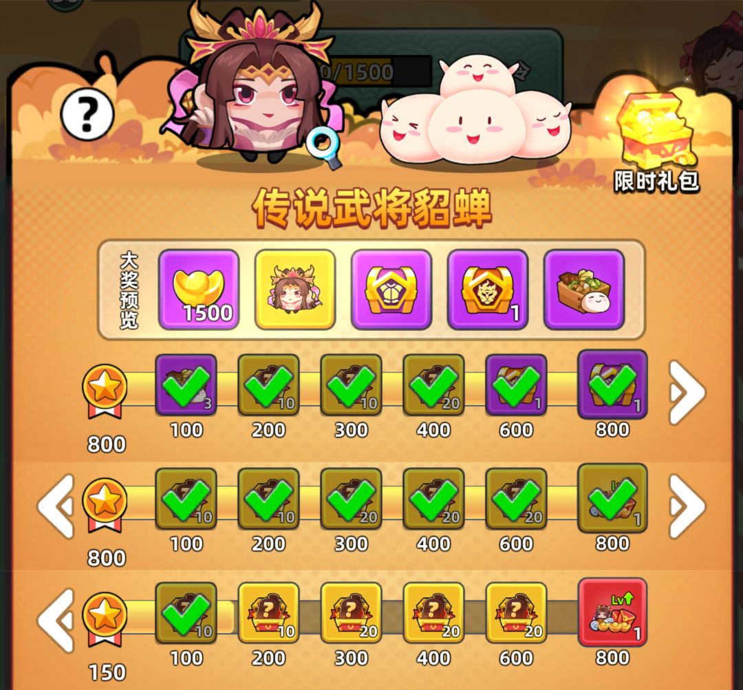 然后就是碎片自选箱,由于后期有同品质武将互换和结义,所以我们只要在武将都开了白板的情况下优先升满一个满星武将,最后再平均升星提高羁绊加成就好。而橙色武将里最好获得碎片的是貂蝉,所以有了白板黄月英以后优先选貂蝉。当然如果你有三星红将可以觉醒的话,选后两个可能好点。