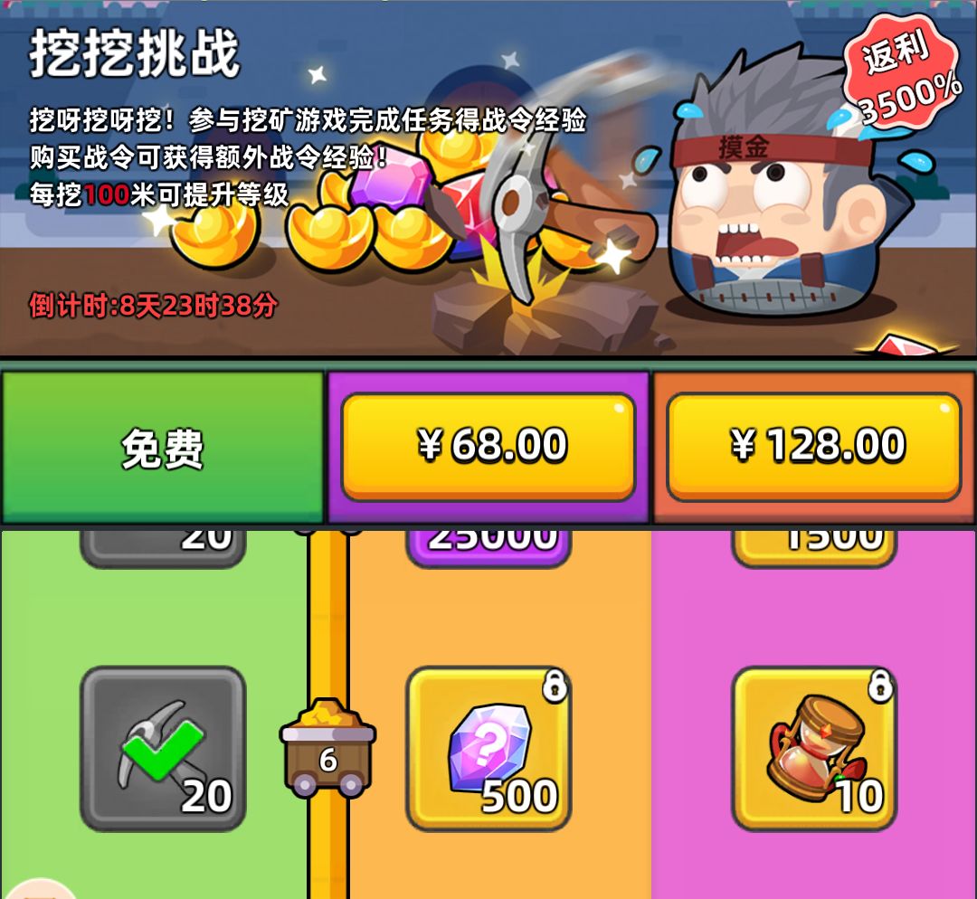 在武将周以前大家要集中囤战令的铁镐,在第四周以前都尽量不要领,一领就全领到了。我就是前几天手误,痛失100多铁镐,这会得多花一两千元宝完成任务了。这个战令结束没领取的铁镐会发邮箱,所以不用担心啥时候攒(但是我不太记得邮件有没有时限了,大家注意一下)。一开始就可以囤了,囤越多越好。