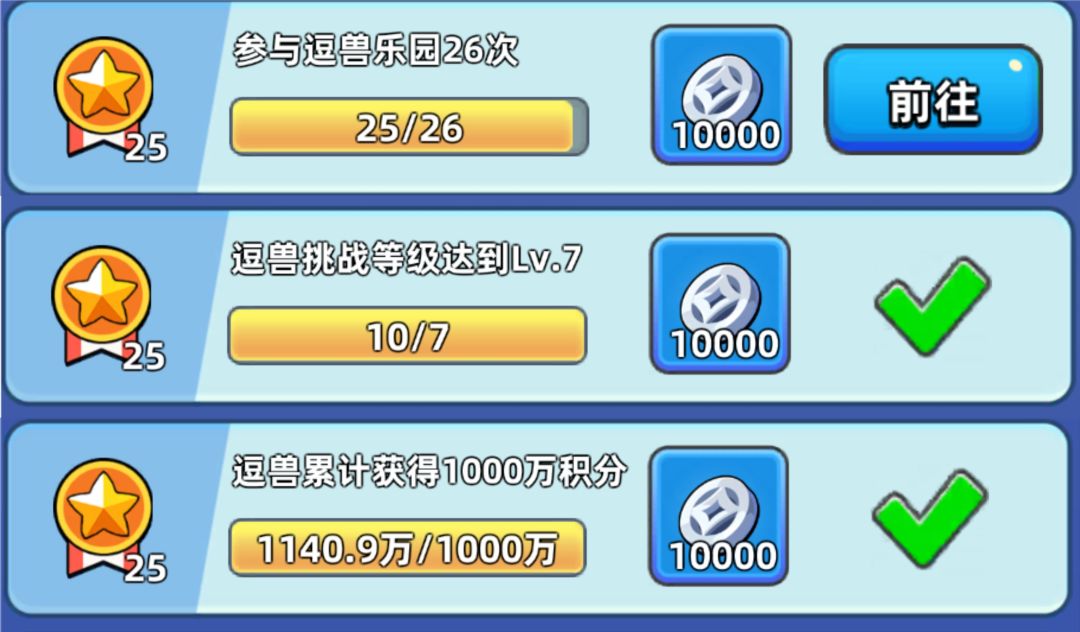 首先介绍这周的主要任务——逗兽。每天免费4次,这个任务很好做满的。我是有天忘了,只打了一次。第三个1000w积分可能有点难打,但是1000w以下的就是500w,应该随便可以拿到,所以说少拿25活跃度也不算什么大事。