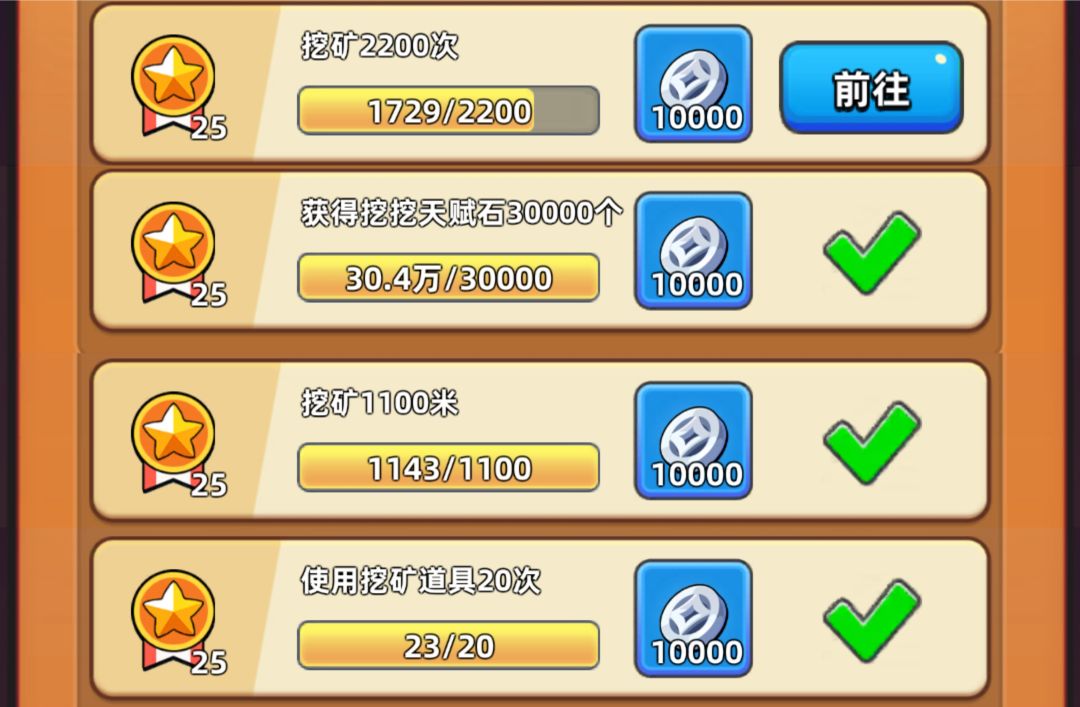 这周任务的重中之重就是以下的挖矿任务,挖矿道具的任务只要每天4个都用了倒也不用担心,挖挖天赋石也是随便达成。但是挖矿距离和次数就比较极限了,大家要注意。