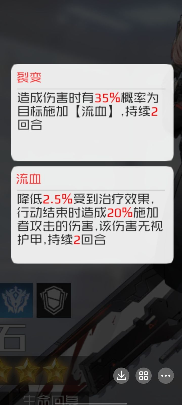 红宝石的1技能是赋予队伍随机3位获得裂变,攻击几率触发流血。5星是35%,觉醒2星是55%,也就是基本上都能触发。