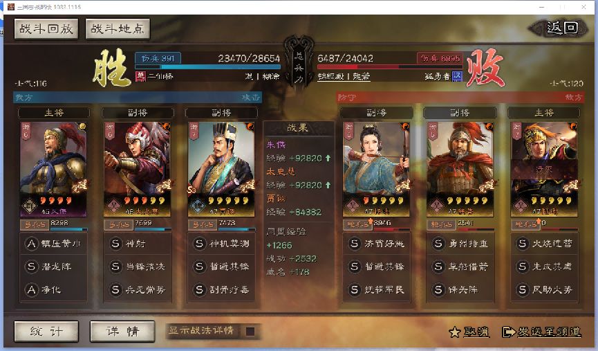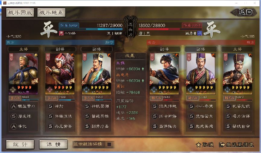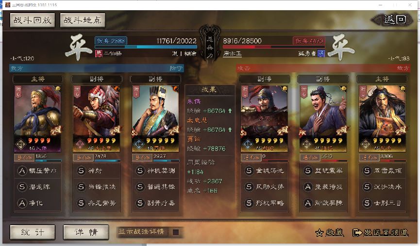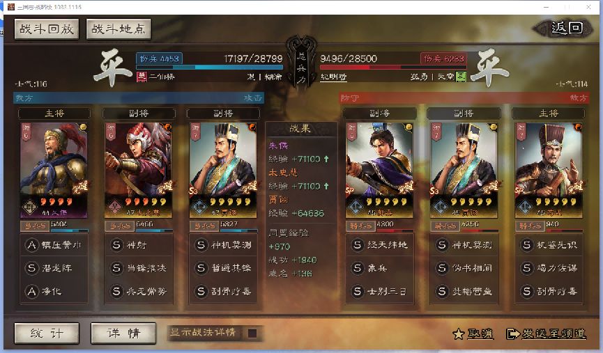 该队伍朱儁打主将,朱儁本身的四维还算好,加之其他武将都比较忙,只能用紫将凑凑,潜龙为主将提供了15%的武力、智力、加速、统率。副将1:贾诩(触发主将战法)贾诩带了刮骨,暂避。