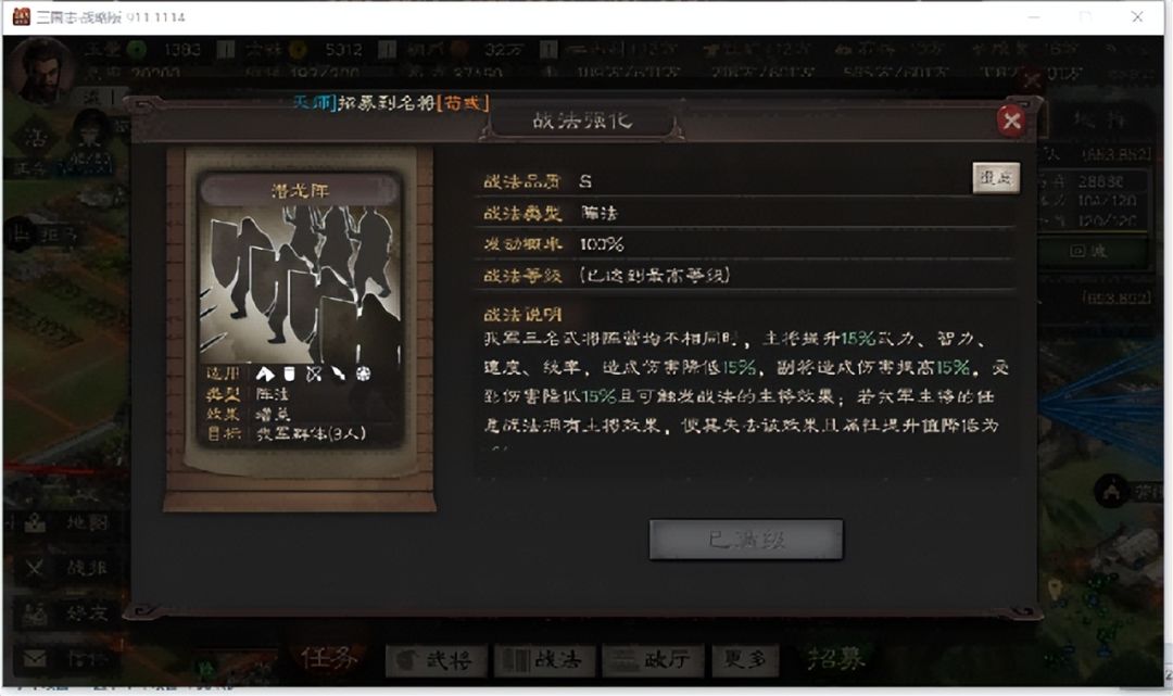 朱儁:潜龙、净化;兵书:避其锐气、守势太史慈:当锋、兵无;兵书:蛮勇非勇、执锐、文韬;贾诩:刮骨、暂避;兵书:以治乱击、鬼谋、将威;当队伍各种配置后,总会有很多多出来的武将或是技能。这时潜龙阵就比较适用,