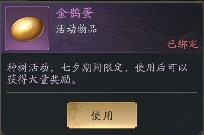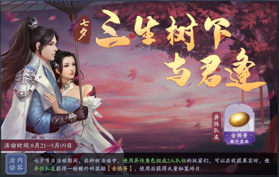 在种树活动中,如果与异性少侠组成2人队伍种树,在收获果实时,你的异性队友可以获得一份额外的奖励金鹊蛋,使用后可以获得大量秘籍碎片。
