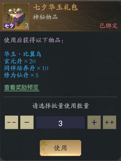 华玉·比翼鸟、玄元丹×20、同伴培养丹×10、修为仙丹×5。