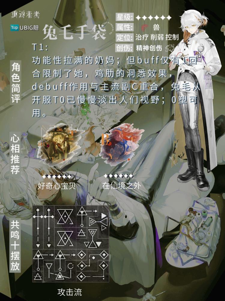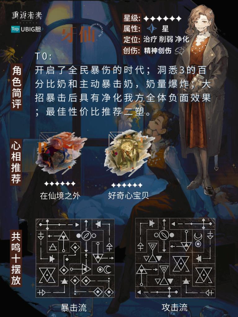 奶妈(共鸣5或7即可)①牙仙:完美的暴击辅奶;一阶卡即带明昧(减敌方抗暴率)。被动增加全体暴伤;洞悉的百分比奶和主动暴击奶,奶量充足;T0级奶辅。