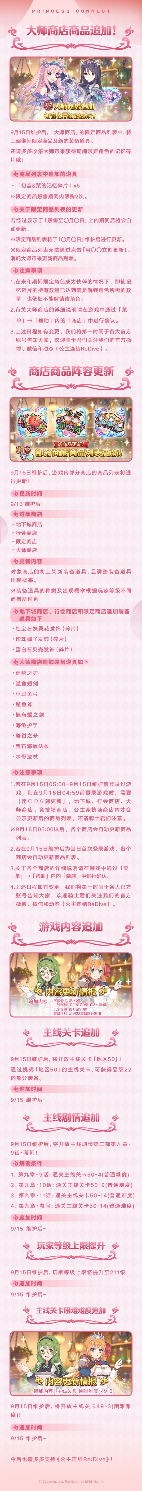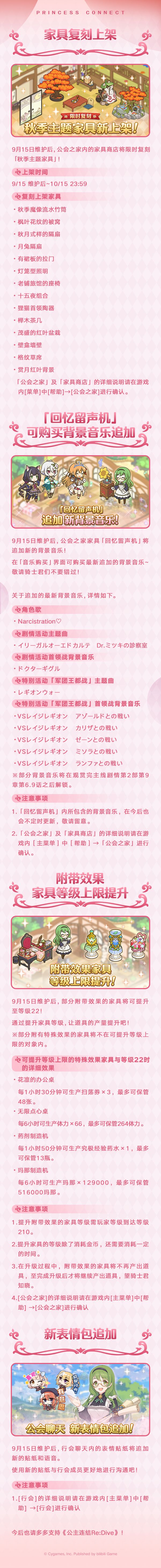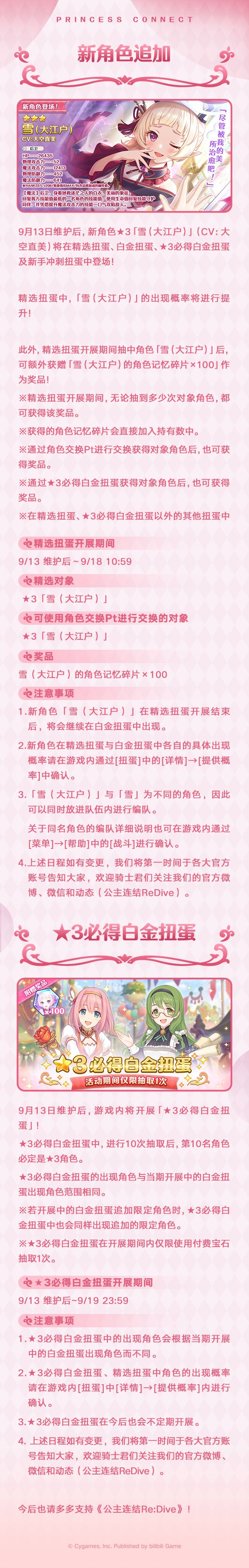 9月13日更新后,新角色★3「雪(大江户)」(CV:大空直美)即将登场!游戏内将同时开启「雪(大江户)」精选扭蛋,开启★3必得白金扭蛋;9月15日维护后,公会之家将限时复刻秋季主题家具,回忆留声机将追加新的背景音乐,附带效果家具等级将进行提升;大师商店将上架新的商品道具,并追加新的游戏内容!