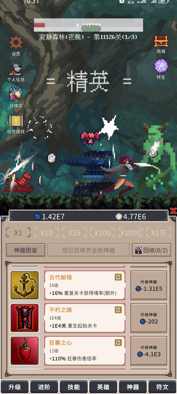 开局进群领礼包+签到,买完两个宠物,剩下钻石直接买1000的丛林,使劲推到130关,直接重生。第二转能推到哪里推到哪里,推不动了广告领离线6小时的收益,会给可观的魂,然后转生。转生切记不要急着买神器,前期神器等级低收益不大,不去没用完魂的加成,推到推不动,开始买神器,洗神器。然后反复。目前已经非常无聊了