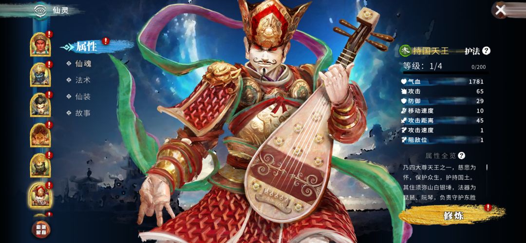 持国天王用音乐普渡众生,普通技能【素问琴诀】对敌方造成木属性伤害,定位是护法型角色,必杀技当持国天王祭出琵琶弹奏【伏魔静心曲】时,可使自身周围一定数目的友军提升攻击力;为了使持国天王长时间对友军形成增益效果、增加持国天王的必杀技释放频次,我们相对应的设计了他的技能设计也围绕必杀技展开。【风火齐至】提高必杀技释放时的攻速;被动技能【余音绕梁】和【荡气回肠】以减少必杀技的灵气消耗和提升友军的灵气恢复速度。