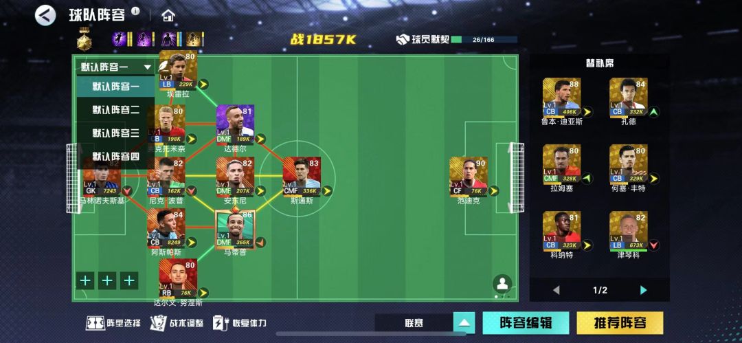 打联赛的过程中,会遇到球员黄牌累计、红牌导致停赛,需要更换球员,而阵容里面可以设置4队阵容,一队是主力阵容(连胜),两队1级阵容(连败降级),两队1级阵容选择不一样的球员,当队伍中出现停赛,可以快速更换另一队球员继续连败!