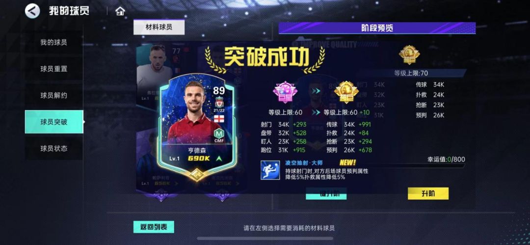 球员可以通过球员突破提升球员的品质,目前最高品质为球王6,提升品质需要同名球员和大量同位置球员