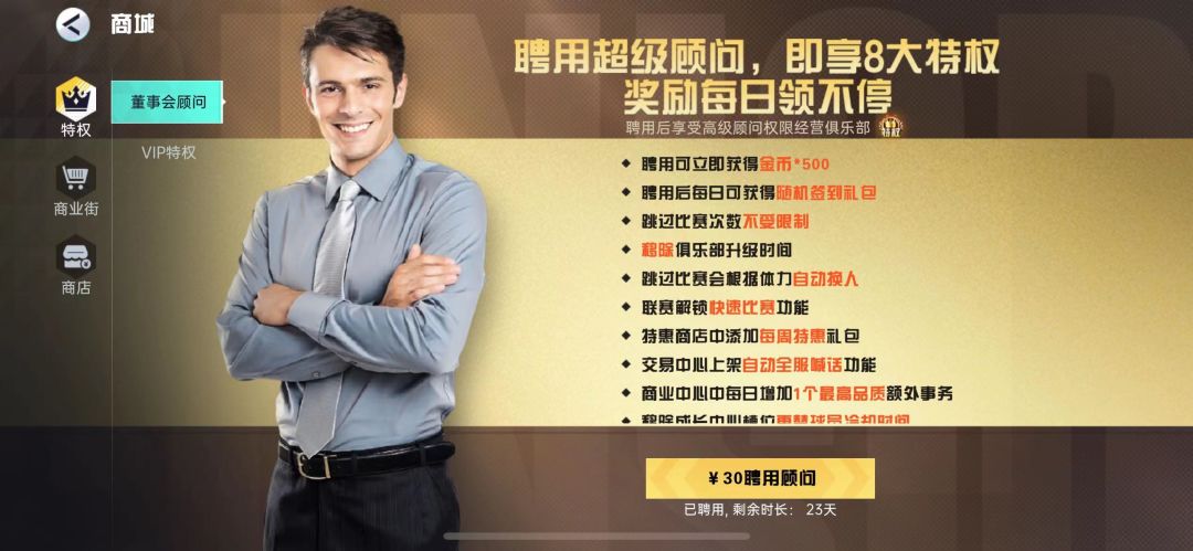 托管中快速比赛需要聘用董事会顾问,董事会顾问是游戏中性价比最高的氪金首选,购买顾问后每天跳过比赛次数不限,可以有效提高刷金币的效率!一定要买!!!