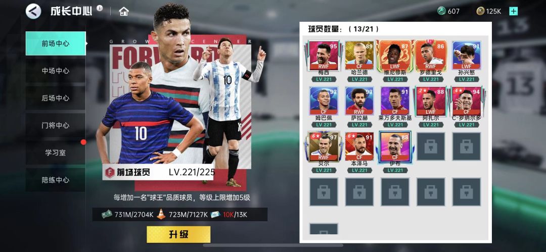球员满级为120级,120级后前往俱乐部-成长中心继续提升,只需要培养10个球员,其余的球员可以放在成长中心,等级继承每个位置最高的三个球员