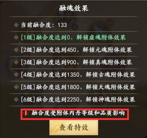 内丹的品质和等级会影响融合度。内丹可以随意拆卸,更换且分解返还升级所消耗的全部魂晶不会有魂晶数量的折损。