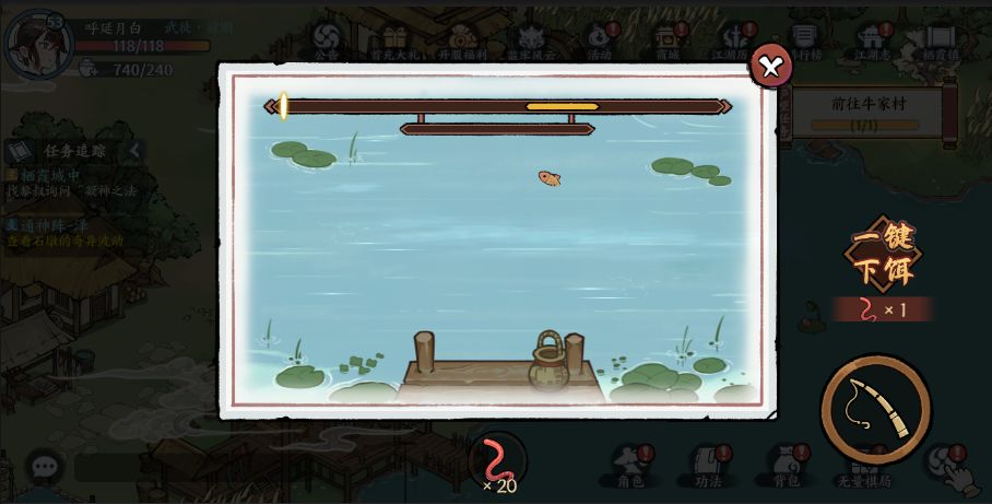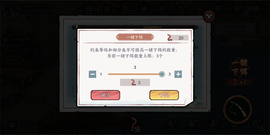 新增一键下饵功能,钓鱼等级和特殊鱼竿可以提高同时下饵的数量上限。(传说中的鱼竿算是一个彩蛋)