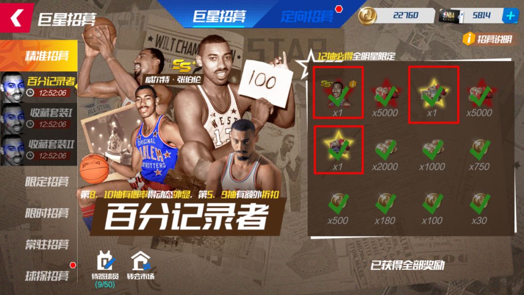 抽取到球员全明星张伯伦,可以在【活动中心】中的【百分记录者】称号限时活动中获得永久称号和头像框!