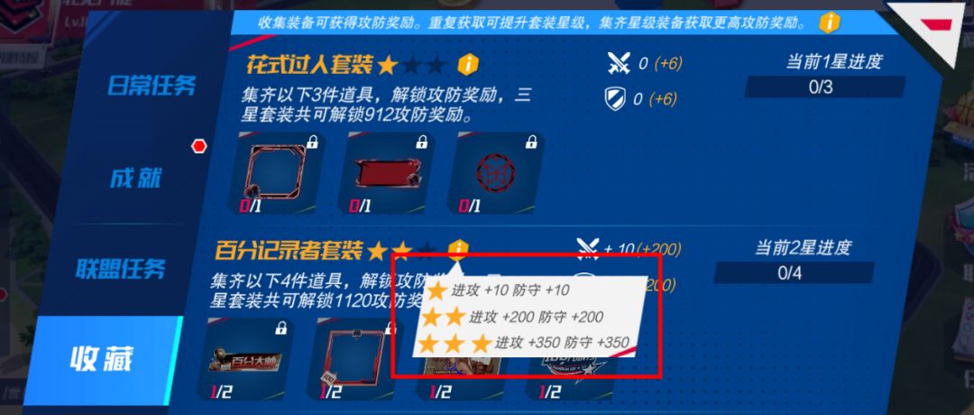 收集外显套装可获得攻防奖励。重复获取可提升套装星级,集齐星级装备获取更高攻防奖励。