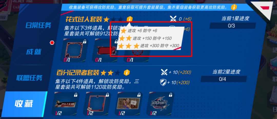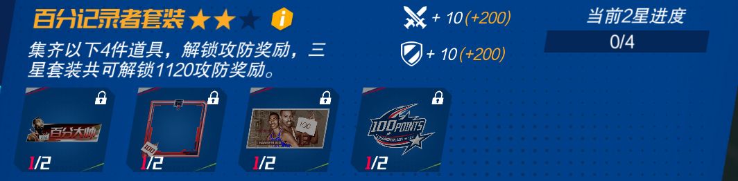 点击套装后按钮,查看该套装各星级可获取的总攻防。本次上新“花式过人”套装和“百分记录者”套装。