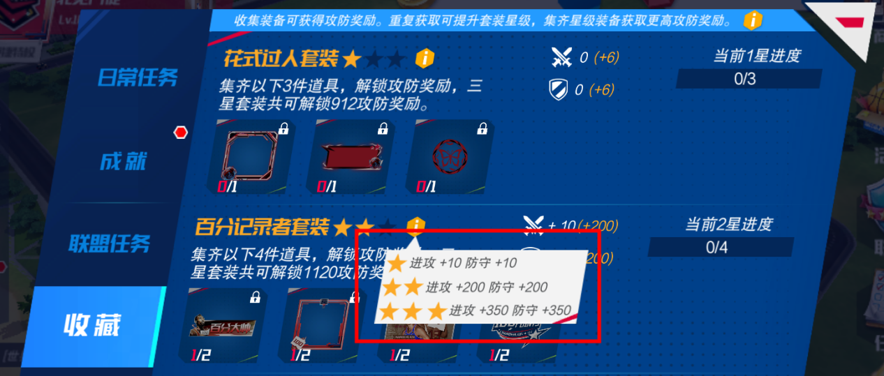 集齐以下三件外显道具(头像框、动态气泡框、球员光环),解锁攻防奖励,三星套装共可解锁912攻防奖励。