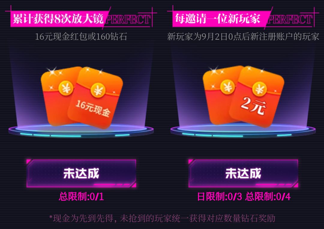 此外,累计获得8次放大镜可得16元现金红包,每邀请一位新玩家还可领取2元现金奖励(新注册账号的新玩家需为9月2日0点之后注册,邀请新注册账号的新玩家的奖励单日限制领取3次,总限制领取4次)~