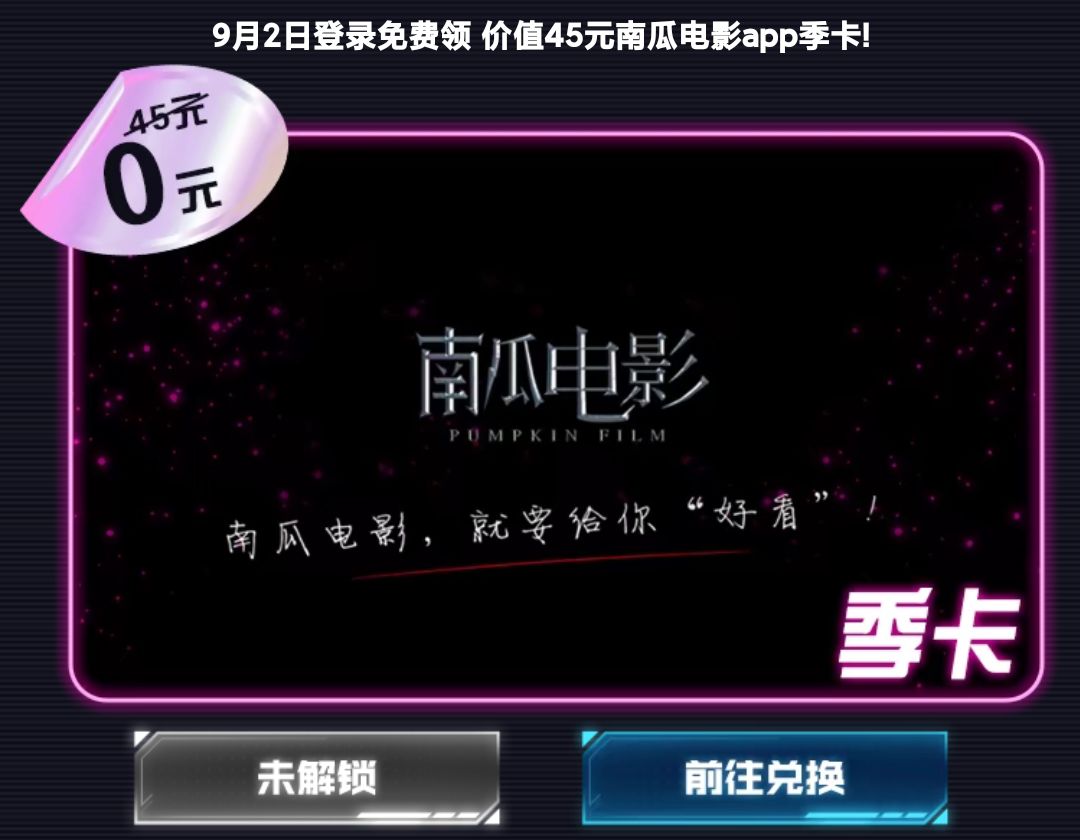 9月3日至9月15日期间,累计登录《QQ炫舞手游》2天,可领取南瓜电影app季卡(限领1次,兑换码有效期为9月2日~9月16日 23:59:59)。