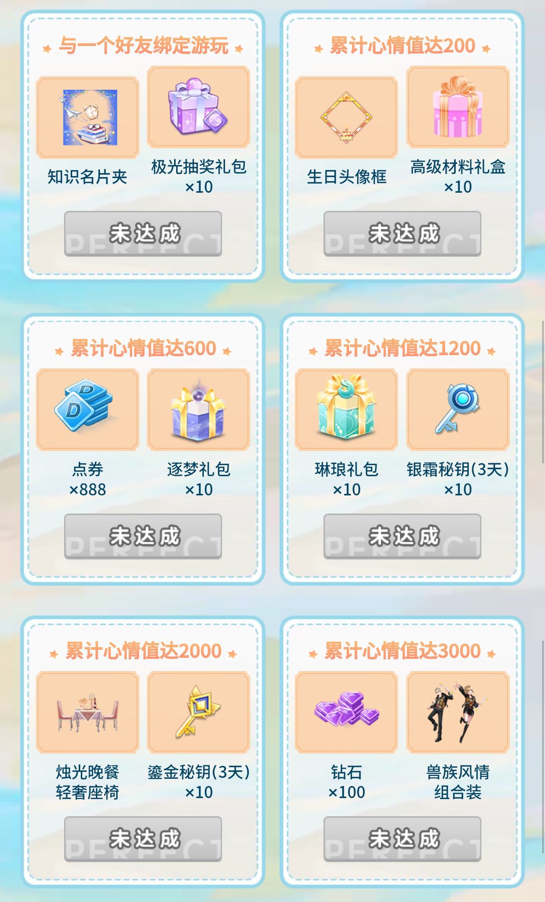 9月9日至9月22日期间,玩家通过邀请幸运官/完成页面任务获得自选步数骰子或普通骰子(符合幸运官身份条件为:2023年9月9日0点后新注册账户的玩家或2023.9.1-2023.9.8未登录游戏的玩家),消耗骰子前进,每到达一个建筑的位置,会自动解锁该建筑,解锁后再次到达该建筑后会升级该建筑,建筑最高等级是3级且对应产出不同的心情值(次日将根据解锁的等级属性增加相应的心情值),累计指定心情值可得钻石*100、烛光晚餐轻奢座椅、兽族风情组合装等好礼;与任意一个好友绑定游玩还能每天加心情值,得知识名片夹&极光抽奖礼包*10。
