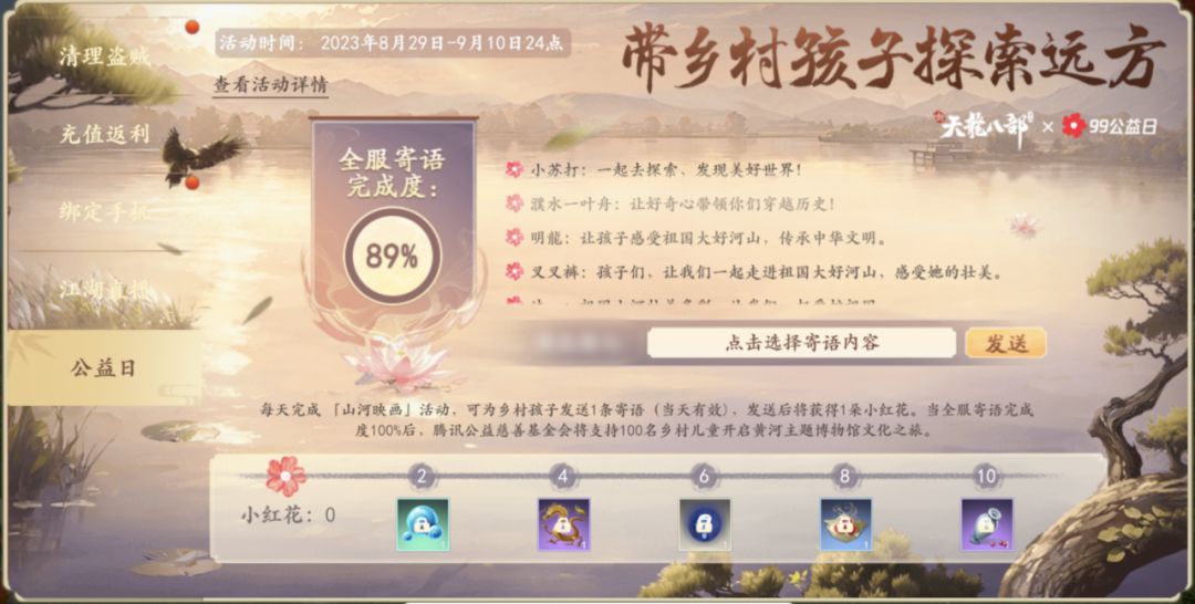 活动期间,少侠每天完成山河映画活动之后,即可返回主界面,点击【精彩活动】进入【公益日】界面填写爱心寄语(发送寄语数量可积累)。