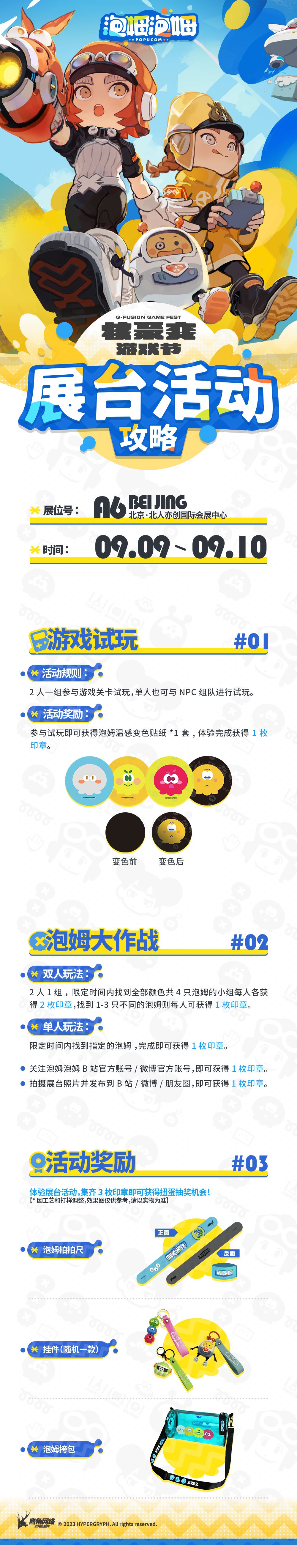 现场将会提供《泡姆泡姆》的试玩体验(本次试玩仅开放教学关卡),只要参与试玩即可获取游戏周边,通过展台各项活动集齐3枚印章更可获得扭蛋抽奖机会!