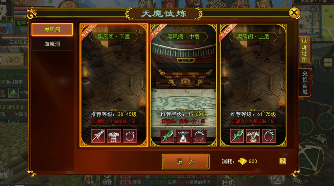 天魔试炼通过游戏内上方的标签就可以打开看到了。天魔试炼中分为不同的副本,每个副本进入要求和难度各不相同。其中黑风阁分为下层、中层及上层。每层都可爆出神品级的装备,且爆率较高,但同时难度也很高,非常不建议一个人去单刷。进入黑风阁需要准备500金条,且江湖录达到小有所成·伍才能进入挑战。同时建议角色等级在45级以上,评分最好在9000以上,生命值在2000以上再去,不然会玩的很痛苦。
