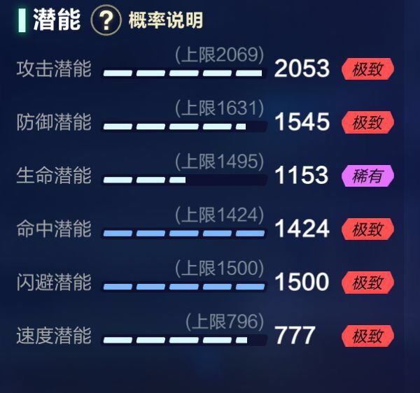 如果用低于主宠品质的宠物合成,只能提升上限及固定百分比(例如宠物潜能下限1000,上限1200,宠物实际潜能1100,那么当宠物合成后潜能上限变为1300时,实际潜能会变成1150而并非1200),如果用同品质甚至更高品质宠物合成时,不仅会提升潜能上限,也会提升宠物自身潜能评级(最高可提升到伪极致但是不会拉满)。