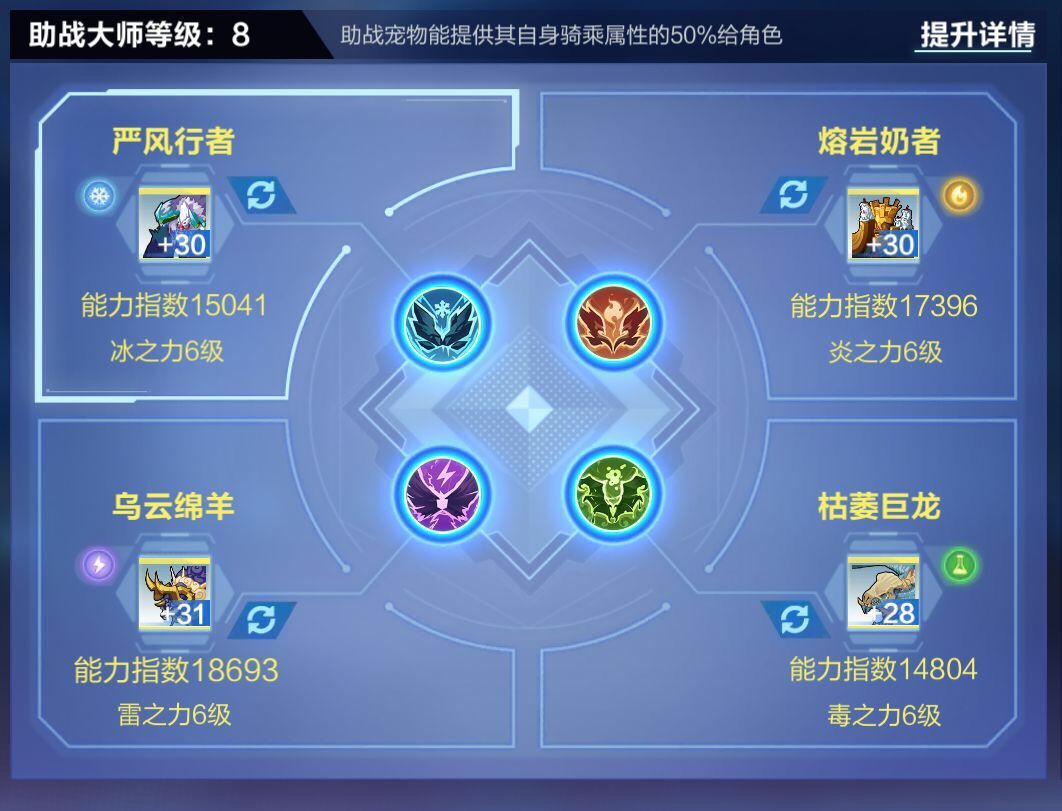 容易被许多萌新玩家忽视的提升方式,首先助战宠物有对应的助战技能(冰火雷毒之力),选择助战时首先应该保证属性相对应才可以激活;