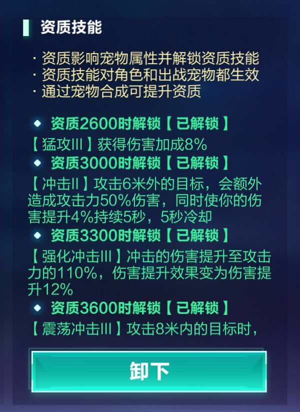 不同品质宠物其解锁资质技能所需资质也不同,换言之品质越低的宠物越容易成型(强度也低一些),资质提升需要宠物合成。