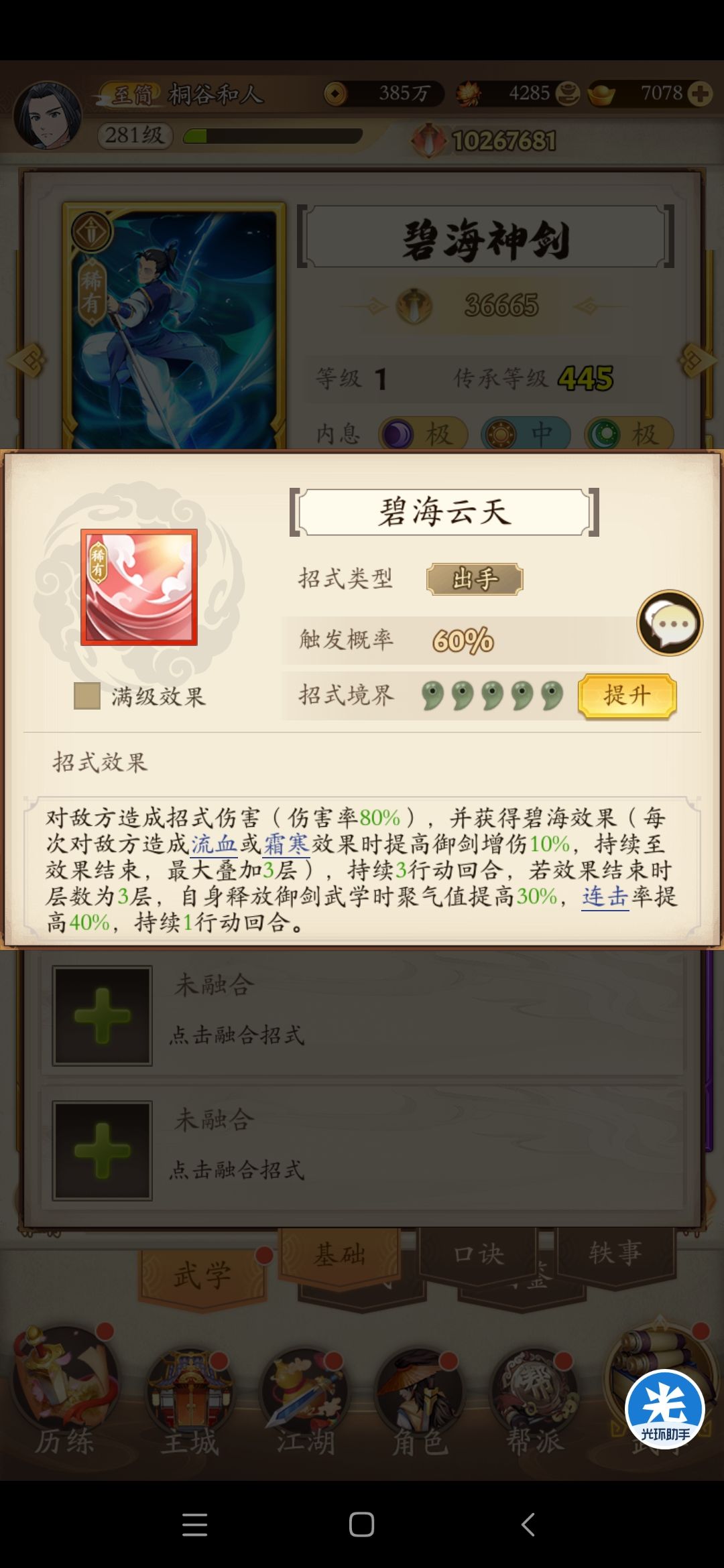 让我们先了解碧海的效果。除了中规中矩的60%出手率和80%招伤以外。拥有的核心机制效果为(御剑增伤)(定点40%连击率)(定点聚气提升拉条效果)。