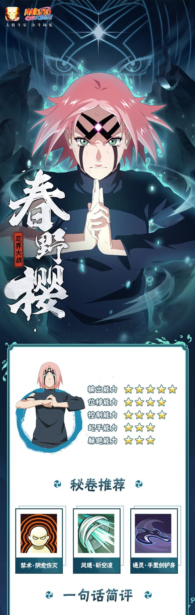 春野樱「忍界大战」蓄力值越高,技能伤害越高,在实战中需要注意蓄力值的积攒,找到合适时机进行爆发输出,是一位爆发高但注重出手时机的忍者。