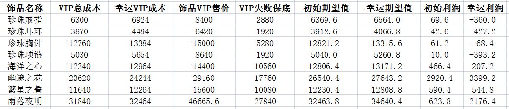 由于永兴大会员的出现,所以各饰品的利润发生了改变,详见表1: