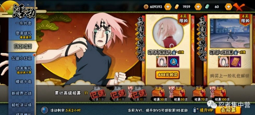 本文首发【忍者集中营】公众号,未经授权禁止转发至其它平台。嗨喽,各位小伙伴们大家好。火影忍者是一款非常受欢迎的格斗手游。随着忍战小樱的正式上架,大量的活动也是一起被推出了,有着大量的资源奖励和金币可以获得,正好可以满足那些不够金币去抽小樱的小伙伴,接下来小ss就为大家来介绍一下。高招活动解析活动详情一.高招返利活动这个活动肯定就是本期最火热的一个活动了,随着新高招的上线,大家肯定也是要去进行抽取的,那这个活动就跟白嫖是一样的了,只要你是成功的招募到了忍者,就有免费的称号“百豪绽放”可以获得,当然也还是有其它的奖励可以获得的。招募3次:随机4级勾玉一个。招募6次:忍战小樱碎片*2+保护符*1。招募10次:忍战小樱碎片*3+保护符*1。招募30次:忍战小樱碎片*5,招募50次:忍战小樱碎片*5(vip10*2)。招募70次:忍战小樱碎片*5.招募100次:忍战小樱碎片*5(vip15*2)