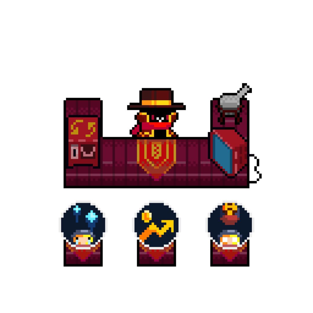 三个摊位上可能会摆上武器、因子、天赋、药水或大量金币,选择其中一件后,所有商品消失,房间也会被封锁,无法出去,摊位上变成诅咒,诅咒都是纯负面效果因子,并且特别逆天,左边的机器可以花重金换诅咒
