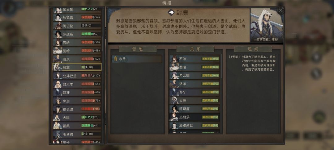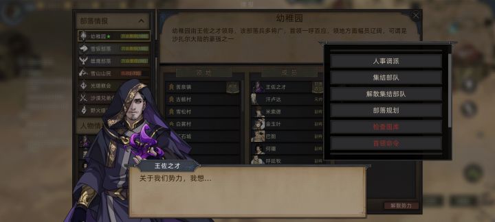 部落外交和谋略:情报界面,点击最上方任意部落,右边的外交谋略措施