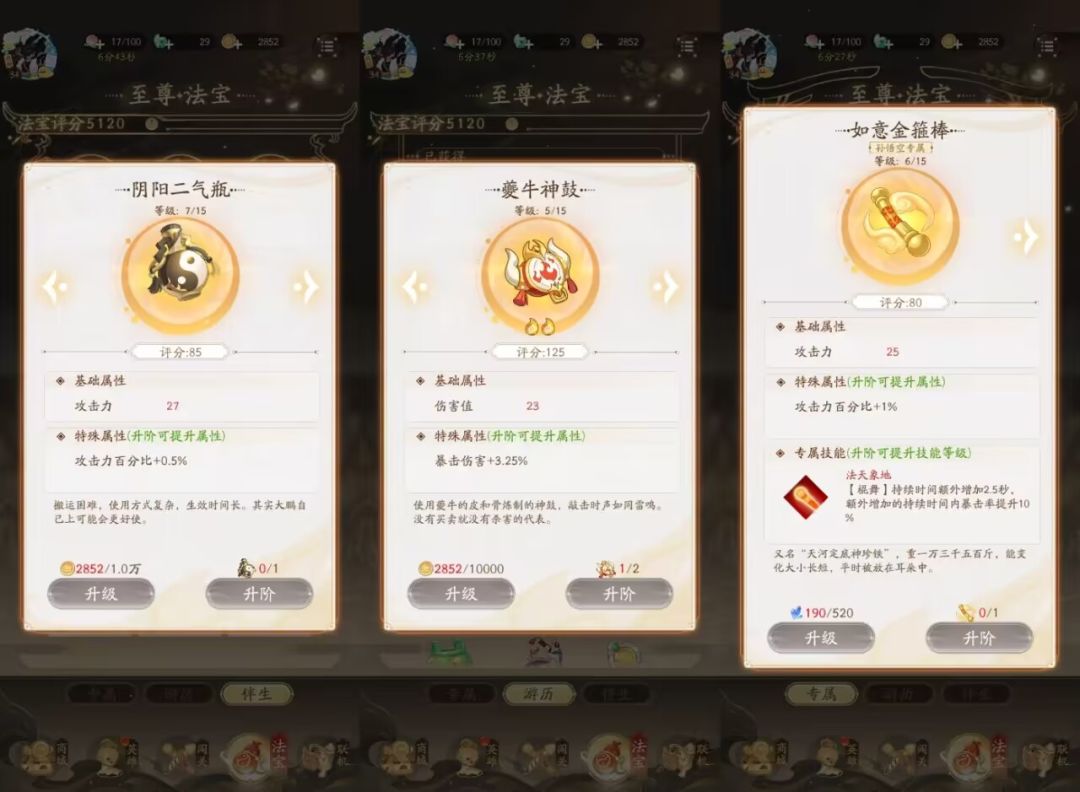 游戏中战力系统主要包含两大部分,卡牌强度与法宝练度,卡牌强度说的是卡牌的等级、阶数与皮肤加成,法宝练度说的是游历、伴生法宝与专属法宝的等级与阶数,在前期的开荒期阶段,我自己的建议是优先升法宝,卡牌一方面是金卡概率低,另一方面这游戏卡牌没有保底必中的说法,也就是说哪怕保底也有可能会歪,而且卡牌提升只是针对单张卡的输出,法宝的提升是提高整体攻击力,萌新刚开始玩时候官方会送160卡牌抽,可以去试试水。之前有小伙伴疑惑新手池子抽不抽呢?我的建议是大胆抽!30抽保底一张金卡怎么算都是划算的,我自己的两个号,一个中了一个,一个中了两个,开荒起玩的也是特别舒服(*ˆ㉨ˆ)