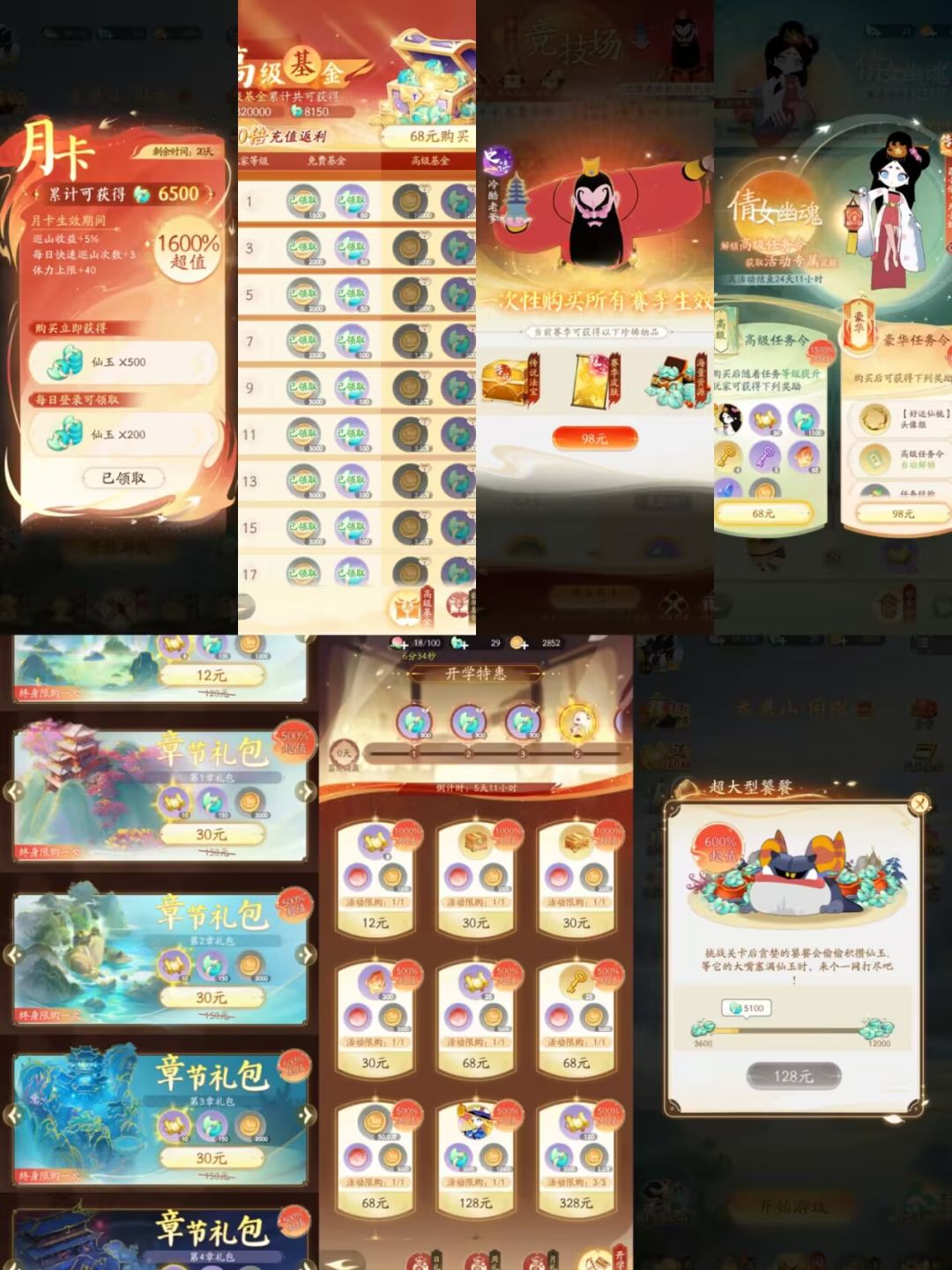 月卡>成长基金>竞技场令牌>任务令>章节礼包>捆绑类礼包>藏宝怪