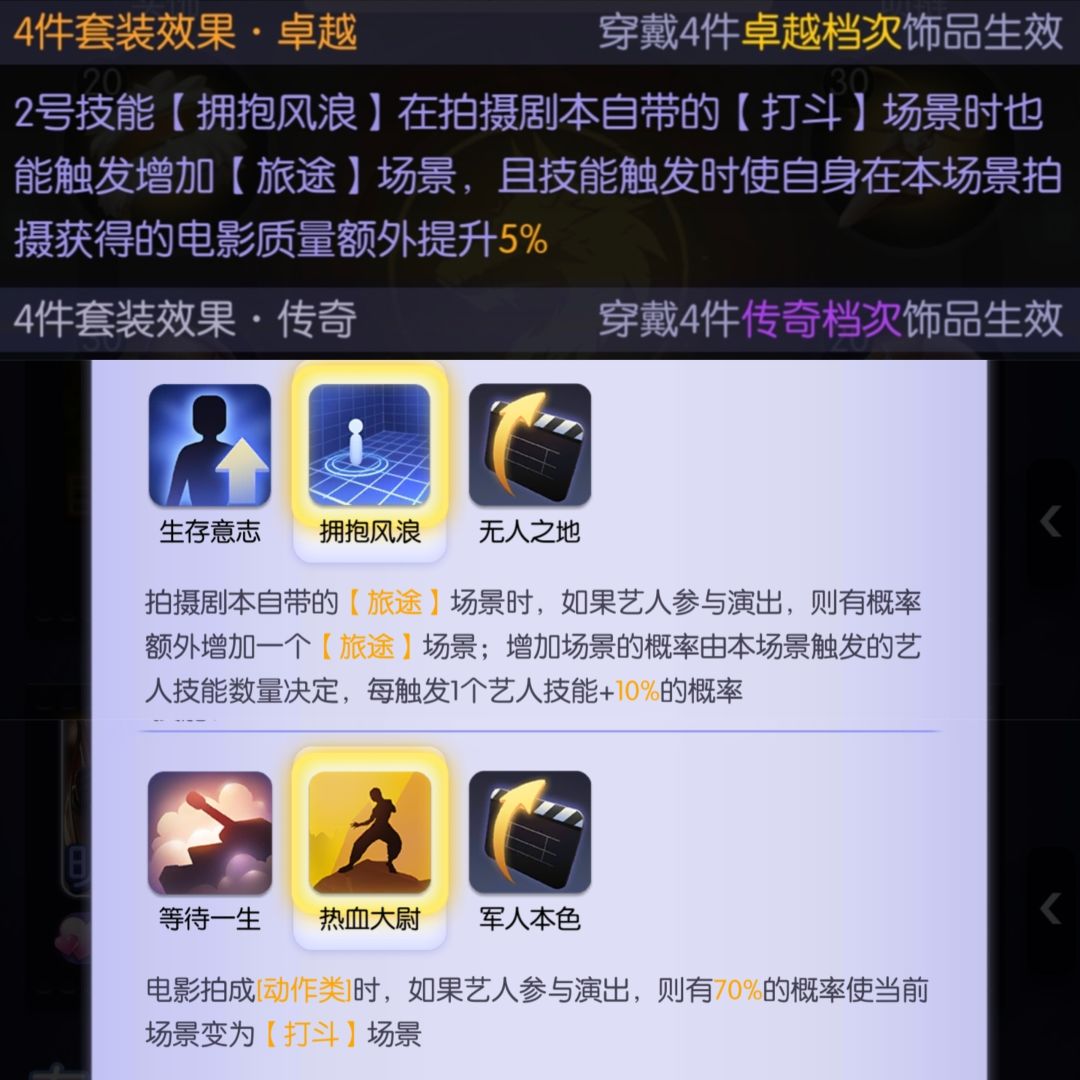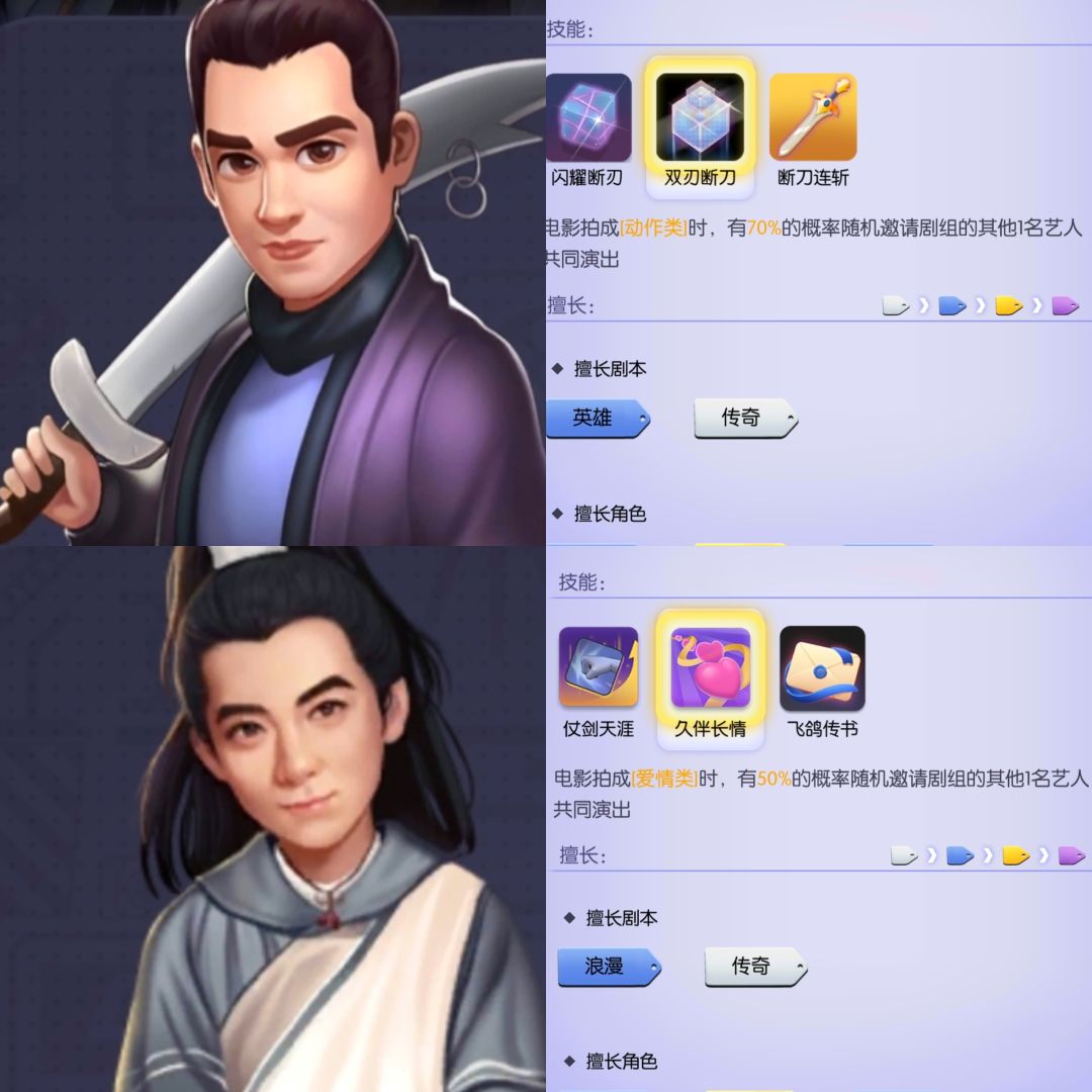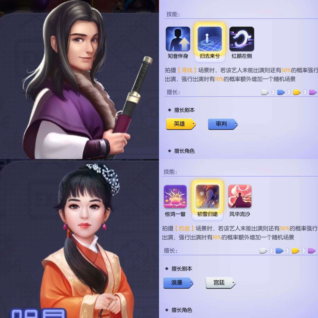 曹定安2技能和羁绊在拍摄动作片时都能拉人;江天誉2技能在拍摄爱情片时可以拉人,并且能可以强行出演对话场景,也能在表演本中搭配韩智圆。