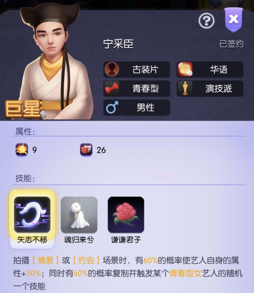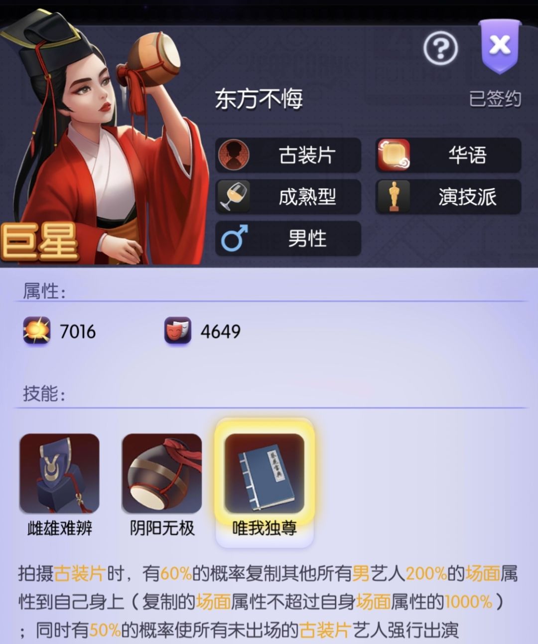 东方不悔的3技能可以有50%概率使所有古装片艺人必然出场并且能复制所有男艺人的属性,搭配1技能触发能够复制到所有的艺人。