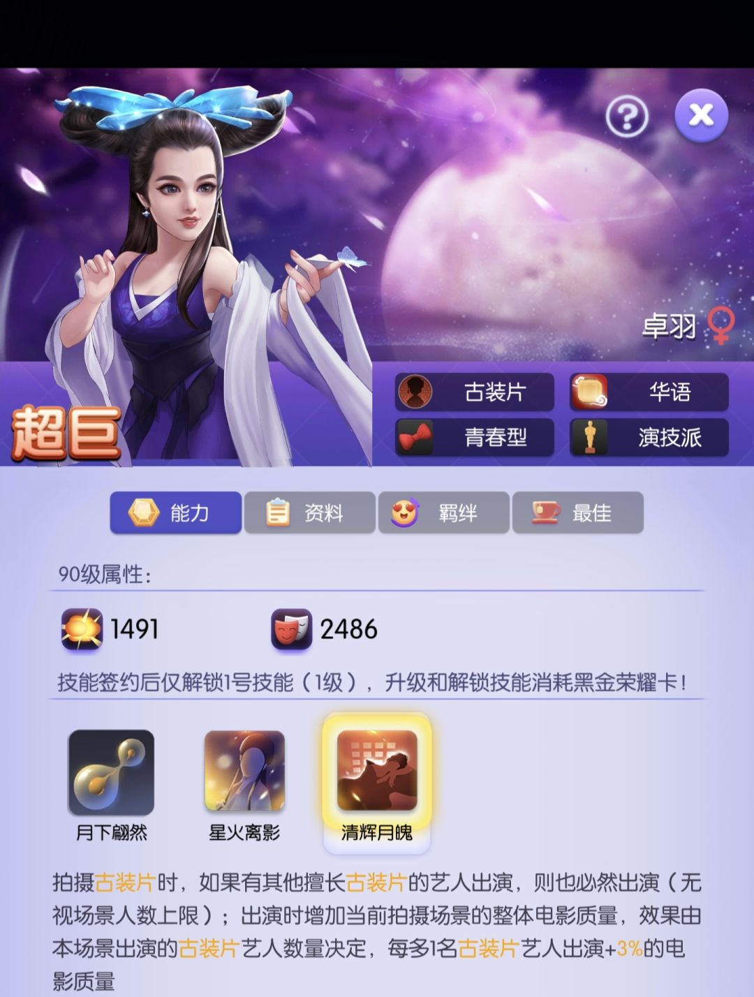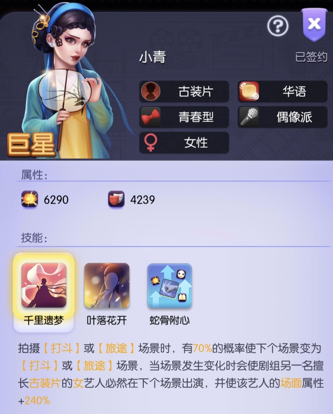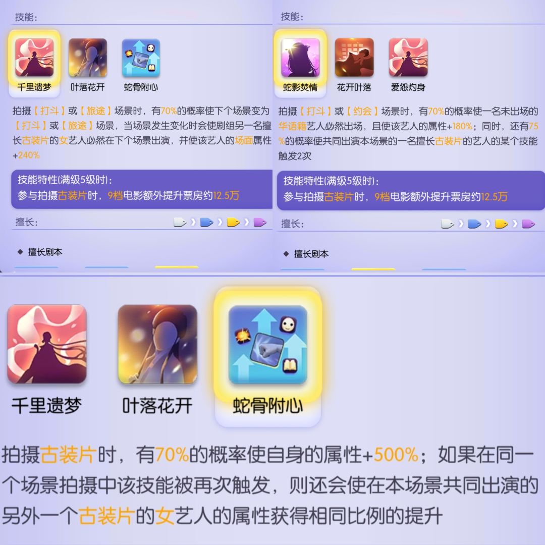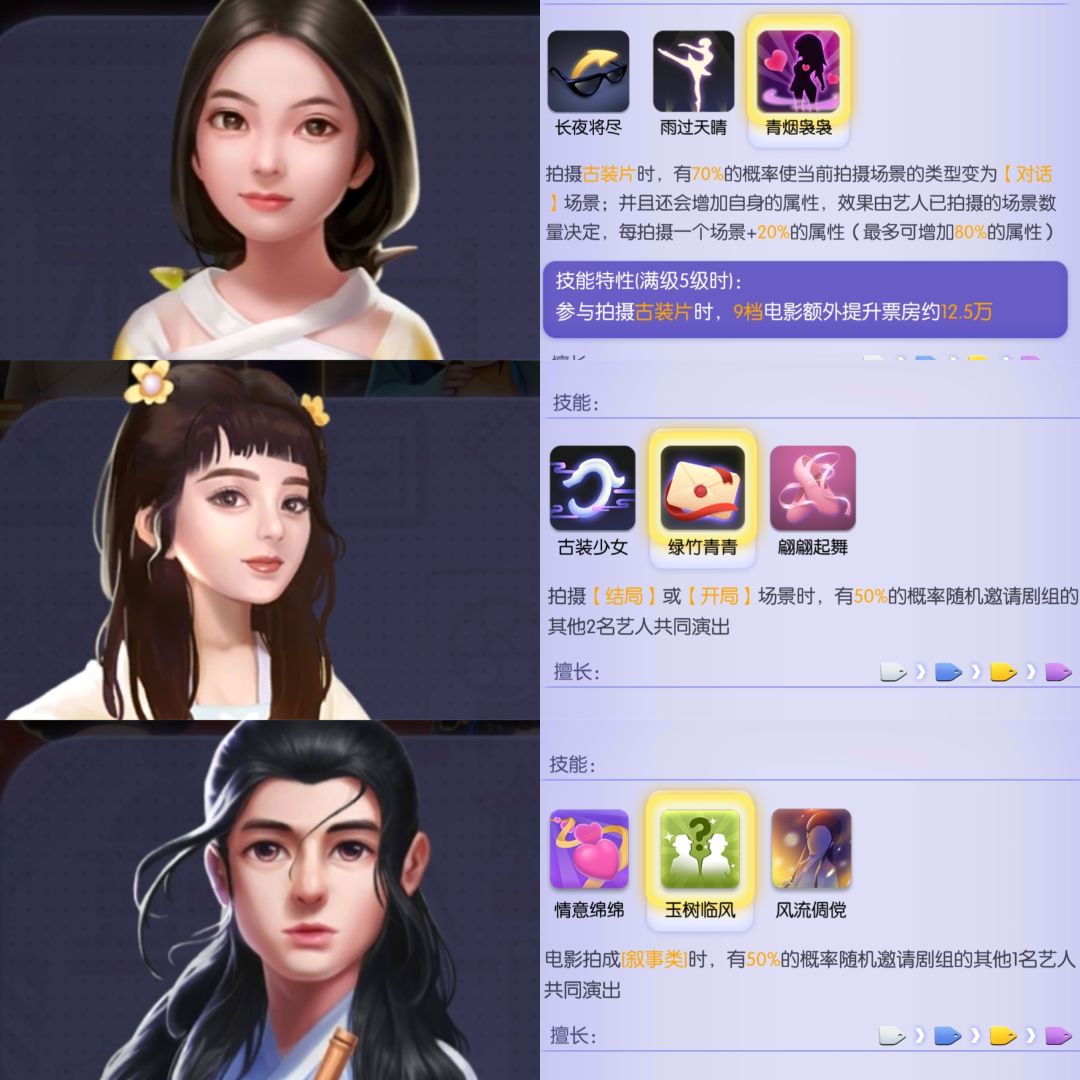 小白的三个技能都是为古装而生,对古装片属性有着极大的提升。1技能集拉人,提高属性,触发技能为一体;2技能在拍摄动作片和爱情片时可以提高演技派艺人属性,而三技能提高自身高额属性。