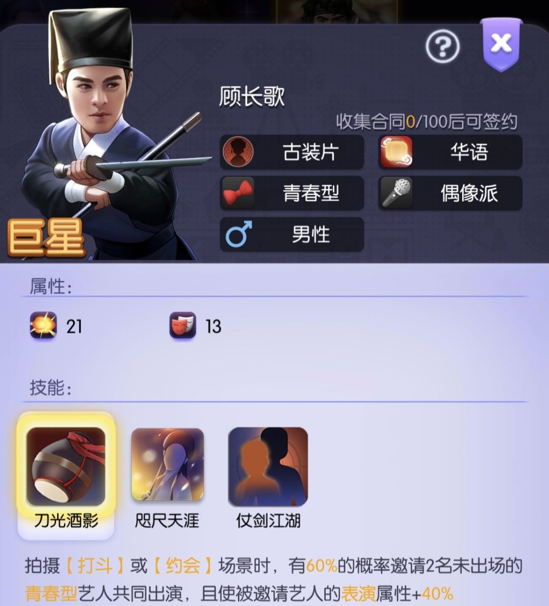 顾长歌的1技能能够在拍摄打斗和约会场景使拉青白上场并增加属性,2技能使白蛇当主角时属性提高,3技能使T2.5中的艺人获得擅长古装片的能力,不要小看这个能力,它能使本来只能触发技能不能发挥属性的T2.5发挥属性优势。