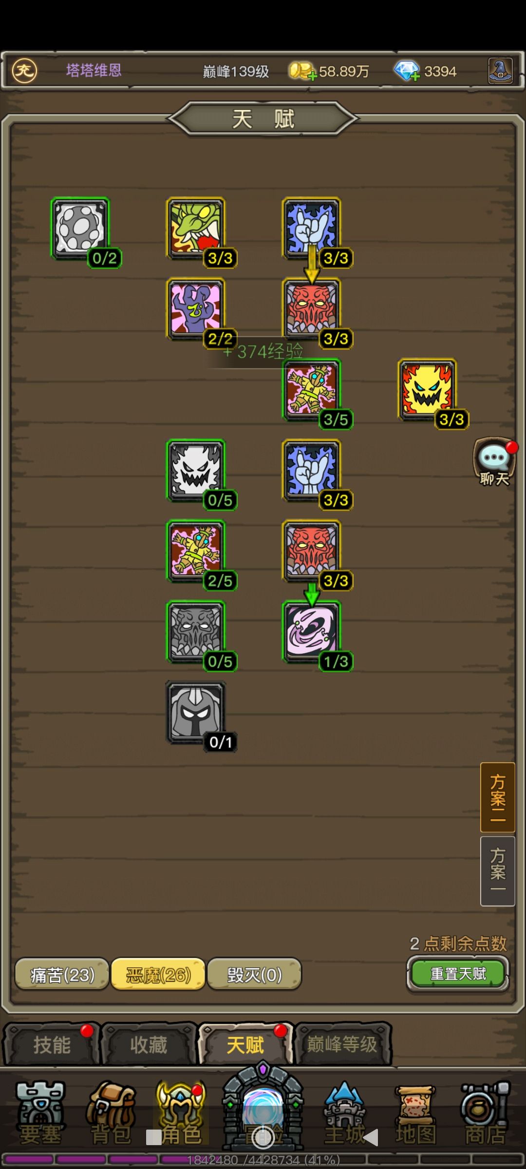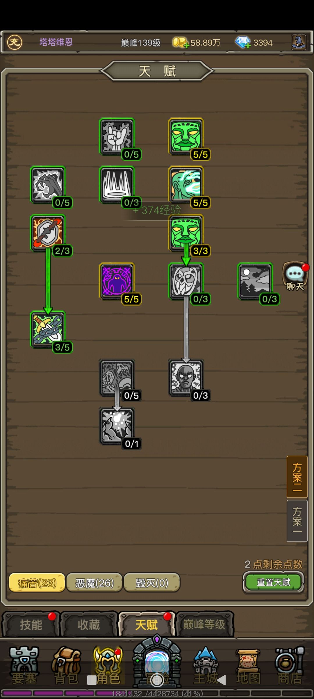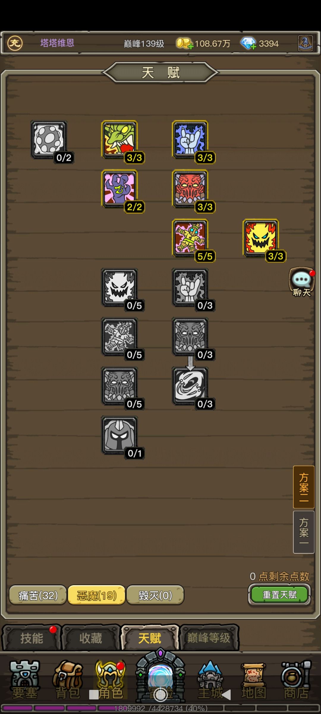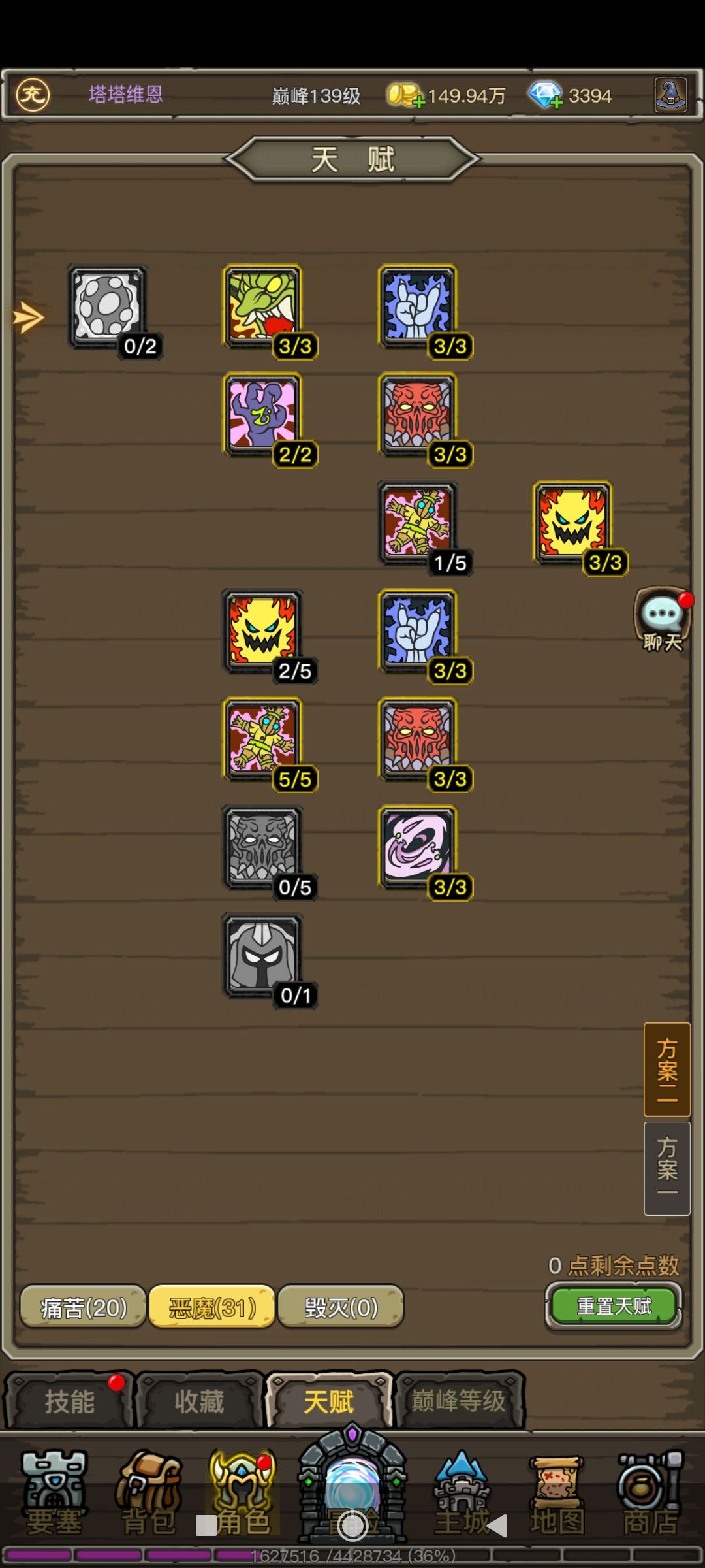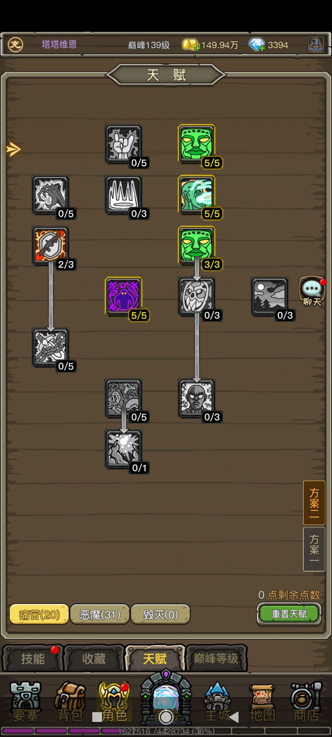 痛苦天赋25点给的5%增减伤效果低下,痛苦无常如同笑话一般。恶魔天赋内智力加10%的天赋很费,3种加点分别加了1.3.5,实际智力分别差20点。