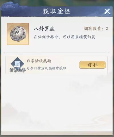 当玩家到达80级之后、将可以从每日任务中获得八卦罗盘。通过八卦罗盘去捕捉幻灵(储存上限最多10个),罗盘是捕捉幻灵用的,一天抓3个,捕捉之后得等12个小时才能收到幻灵,也可以用金龙加速(不需要加速,氪佬也不需要!!!)