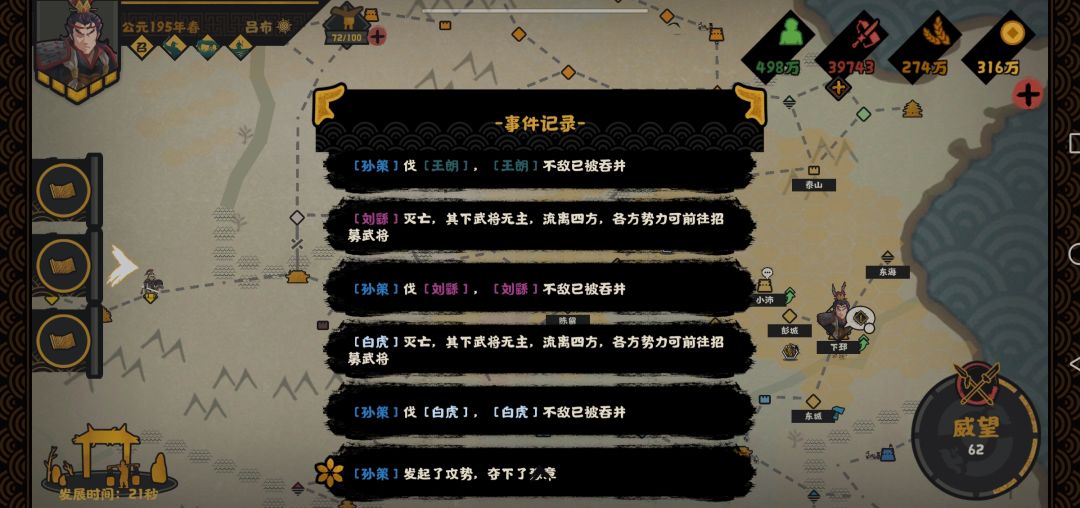 消灭孙策后,就要面对四个偏安一隅的势力,来到压力最大的地方。(这局可能运气不好,辽东和张鲁强的吓人…防御格挡buff基本叠满了,甚至我攒了一整局的军团被张鲁灭掉了,也导致最后打张鲁和辽东压力爆表…)