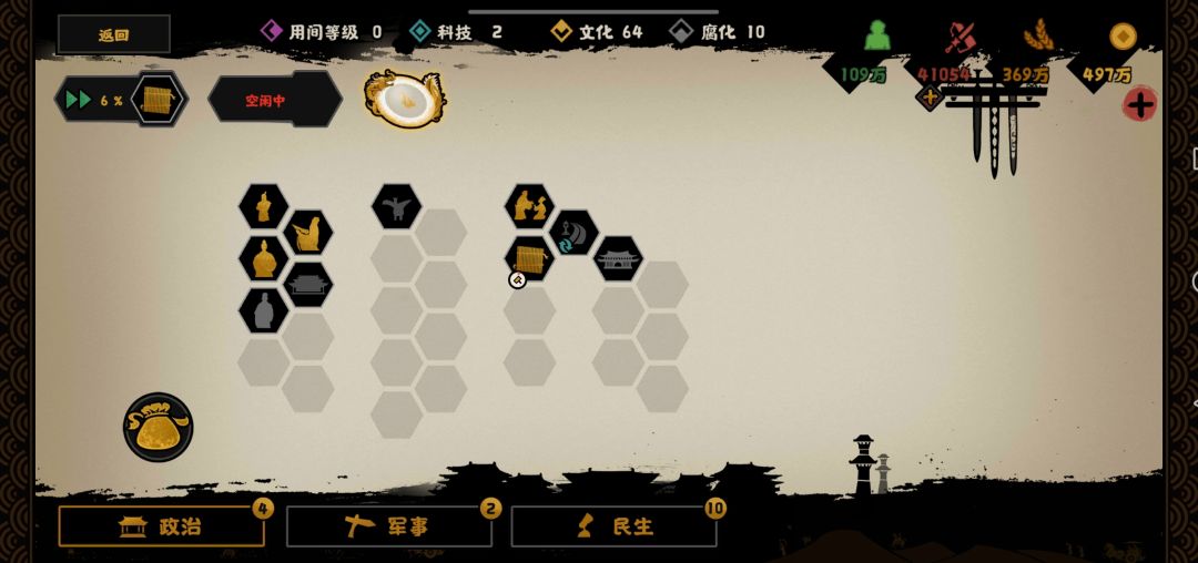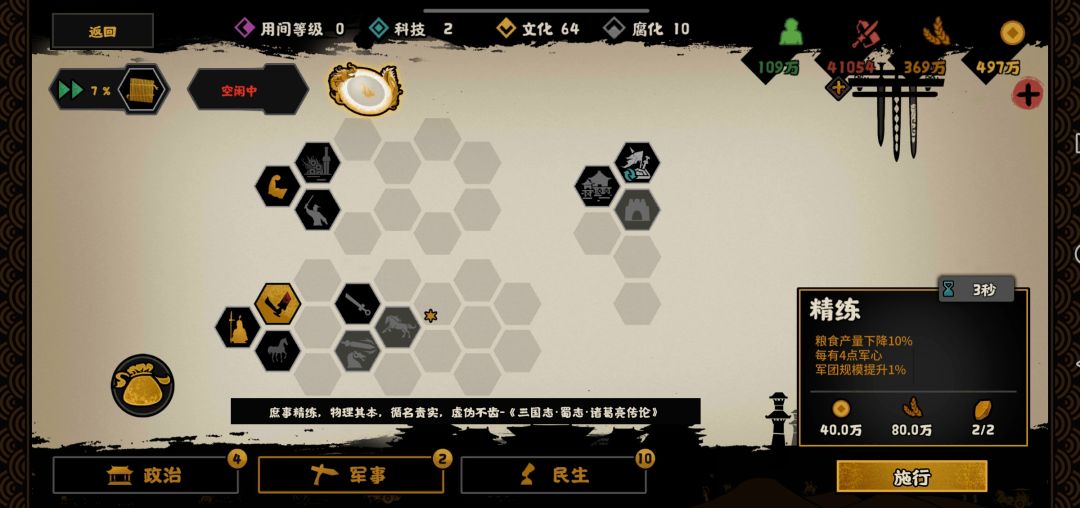 同时确保前期拥有较高的军心,利用民生政策给的铁,点出军事政策【精炼】,并在有足够军心时,点出民生政策【征壮丁】,保证前期拥有大概六万左右的士兵。