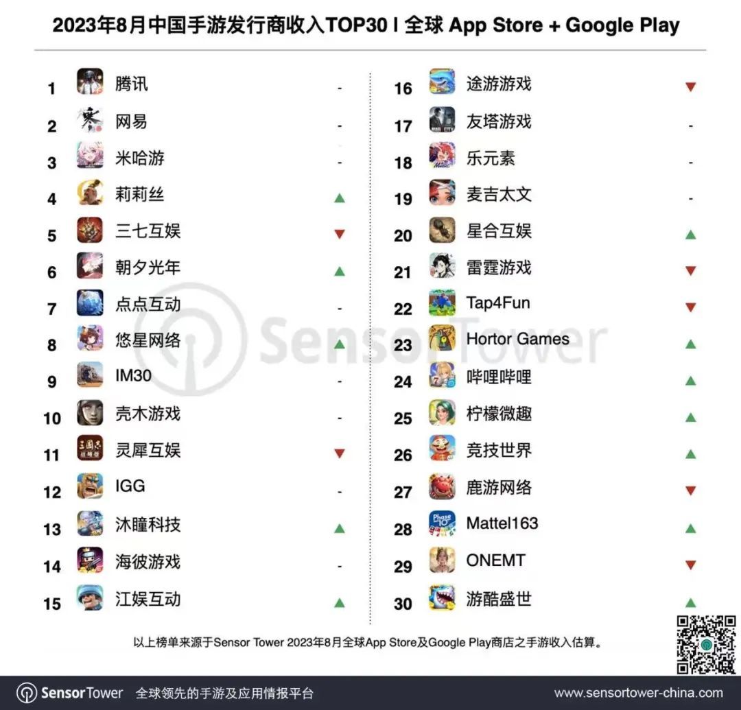 近期,Sensor Tower发布了2023年8月中国手游发行商的全球收入排行榜(统计数据来源于全球App Store和Google Play的收入)。